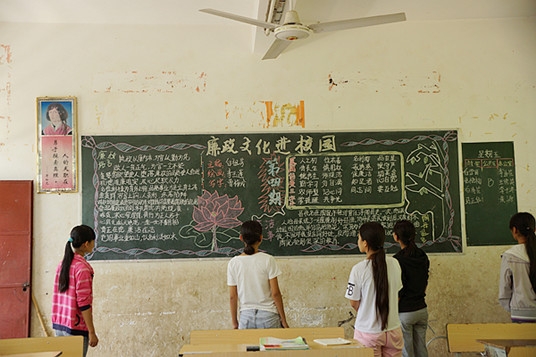 圖為大黑山鄉(xiāng)中學(xué)由同學(xué)們刊出的廉政文化進(jìn)校園黑板報(bào)
