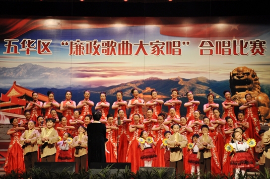 一首首激揚(yáng)高昂的廉歌,弘揚(yáng)正氣,激濁揚(yáng)清,一陣陣熱烈的掌聲,是臺(tái)下觀眾強(qiáng)烈的共鳴。7月24日,由五華區(qū)紀(jì)委主辦、區(qū)文體旅游局承辦的“廉政歌曲大家唱”在抗戰(zhàn)勝利紀(jì)念堂禮堂舉行,全區(qū)20家單位參賽單位近700余名黨員干部參加合唱,1000余名干部和群眾觀看了比賽。