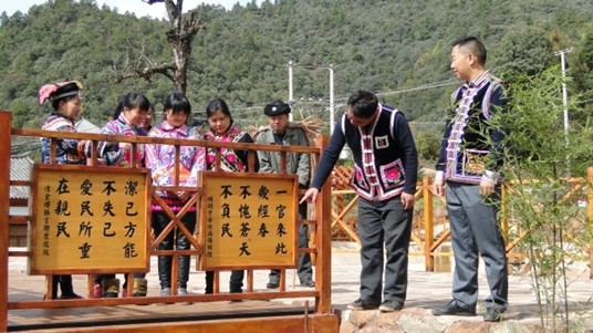 融入彝族文化,寓廉于景。該縣積極尋求農村廉政文化的新形式、新載體。在美麗鄉村建設中,結合當地彝族文化特色,把廉政文化建設作為規劃建設的重點內容。曇華鄉先后整合了壩塘建設、休息長廊、墻體彩繪、亭子和彝族文化生態保護區等項目資金,并在項目建設中遵從依山就勢,融入自然的理念,挖掘當地歷史文化、民俗風情中的廉潔文化資源,建成以彝族文化為主題的蓮池公園,占地5300米,由一閣、一臺、一廊、一橋、雙樹、雙亭、雙拱橋、三池、四桌、五牌、十石、噴泉、步蓮道等主要園林小品組成。