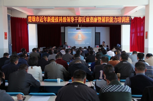 11日9日,楚雄市近年新提拔科級領導干部反腐倡廉暨履職能力培訓班在市委黨校舉行,2013年以來提拔的110名市管干部參加了集中培訓。