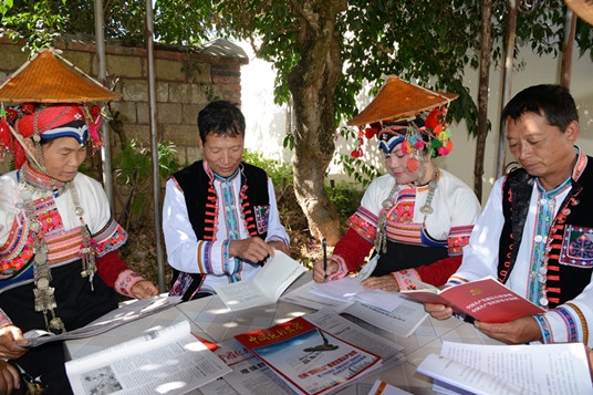峨山縣多措并舉,嚴(yán)字當(dāng)頭,快字為先,實(shí)字為本,制定宣講輔導(dǎo)方案。縣級(jí)領(lǐng)導(dǎo)率先垂范帶頭宣講,層層落實(shí)宣傳貫徹十八屆五中全會(huì)精神的政治責(zé)任,學(xué)習(xí)宣傳好《中國(guó)共產(chǎn)黨廉潔自律準(zhǔn)則》和《中國(guó)共產(chǎn)黨紀(jì)律處分條例》。突出“先”字抓學(xué)習(xí),突出“廣”字抓宣傳,突出“實(shí)”字抓教育,通過(guò)媒體廣泛宣傳,干部全面宣講和專(zhuān)題輔導(dǎo),用彝、漢、哈尼族等語(yǔ)言組織全縣黨員學(xué)習(xí)《準(zhǔn)則》和《條例》,百姓宣講團(tuán)巡回宣講九期,征訂學(xué)習(xí)資料1200份,組織400多名科級(jí)及以上干部參加了黨風(fēng)廉政建設(shè)知識(shí)考試,迅速興起學(xué)習(xí)熱潮。圖為小街街道辦事處水車(chē)田村黨總支書(shū)記張家榮組織村三委干部通過(guò)《中國(guó)紀(jì)檢監(jiān)察報(bào)》、《中國(guó)紀(jì)檢監(jiān)察》等報(bào)刊雜志集中學(xué)習(xí)《準(zhǔn)則》和《條例》。