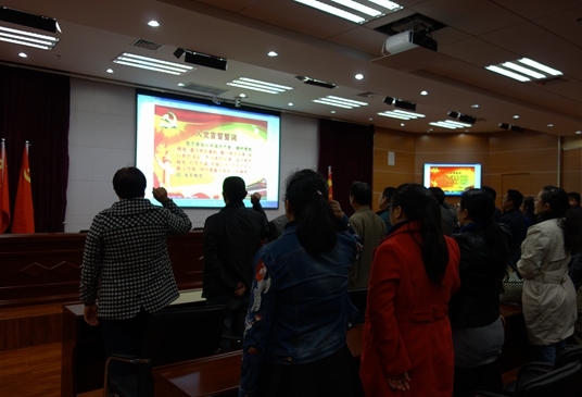 觀看專題片后,全體黨員在報告廳內莊嚴地舉起右手重溫入黨誓詞。