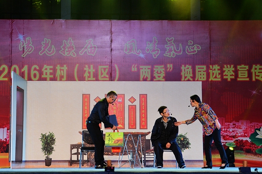 “黨中央、發(fā)號(hào)令,換屆工作“九嚴(yán)禁”,一是嚴(yán)禁結(jié)派又拉幫,團(tuán)團(tuán)伙伙結(jié)私黨;一旦發(fā)現(xiàn)此情況,紀(jì)律處分不饒放。一律不饒放!二是嚴(yán)禁拉票來(lái)賄選, 非組織活動(dòng)原形現(xiàn),取消資格不推薦,依法處理不能免。一律不能免!……”演員們正在舞臺(tái)上激情四溢的表演快板《風(fēng)清氣正好換屆》。
