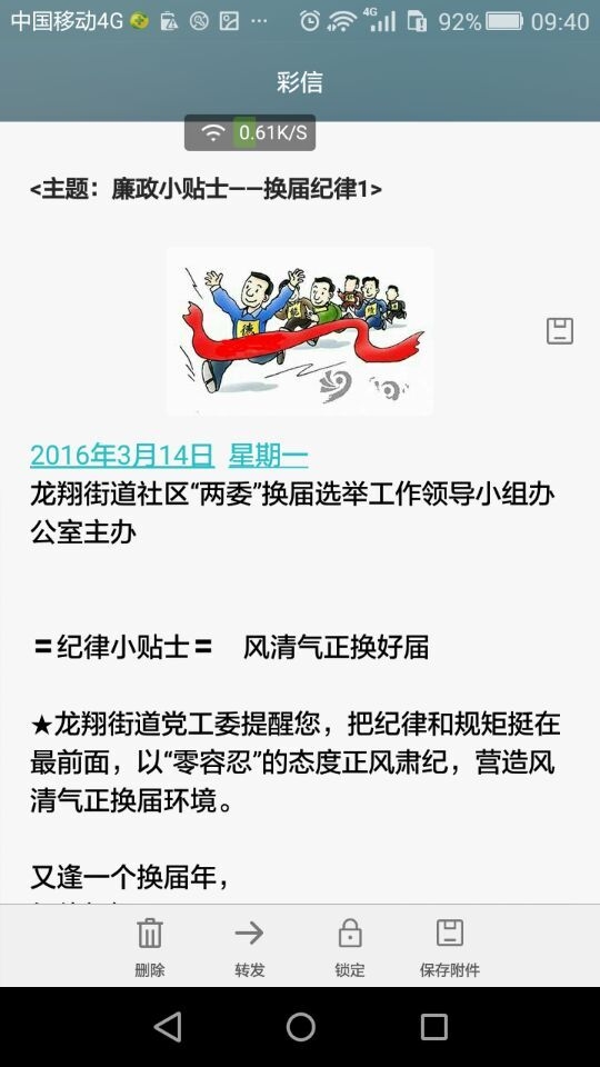 據悉,五華區龍翔街道《紀律小貼士》在換屆期間將每周編發一期,以手機報的形式發送給街道及社區工作者110余人,時時刻刻提醒他們紀律就在身邊,及時打好換屆“預防針”。