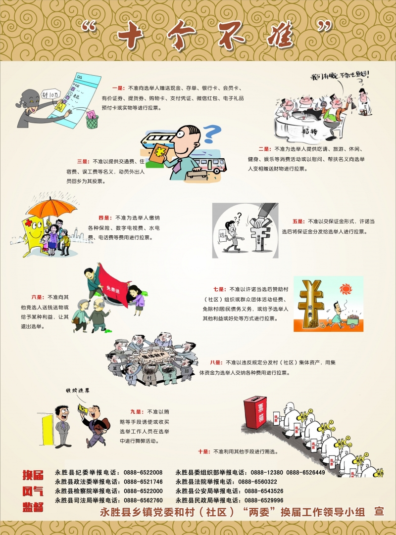 在今年黨委換屆工作中,為加大對換屆工作紀律和政策的宣傳,永勝縣創新宣傳工作方式,采用漫畫的形式,形象地描繪解釋了中央“九個嚴禁、九個一律”、“十個不準”和云南省委“不能確定為村(社區)和村(居)民小組干部候選人的十五種情況”等換屆工作紀律和政策規定,并制作印刷成精美的掛圖20000冊發放到全縣15個鄉(鎮)149個村(居)委會1433個村民小組,以及75個縣直部門,廣泛宣傳換屆工作紀律和政策,同時,在掛圖中還公布了縣紀委、縣委組織部、縣委政法委、縣公安局、縣法院、縣檢察院、縣司法局、縣民政局等八部門換屆紀律監督舉報電話。廣大農村群眾和基層干部紛紛反映,通過用漫畫的形式宣傳解釋紀律、政策的方式新穎,大家愿意看,內容更直觀,易懂易記,宣傳效果十分明顯。(張忠輝)