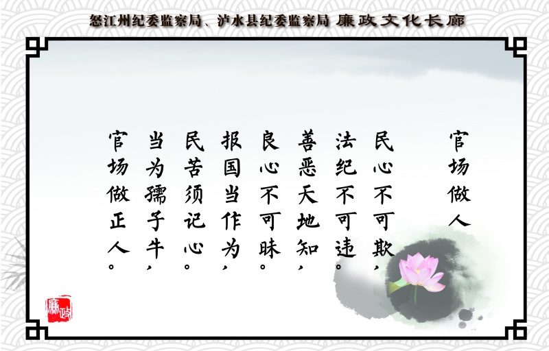 為營造一個(gè)風(fēng)清氣正的社會(huì)環(huán)境,把近年來反腐倡廉取得的新成效、面臨的新形勢帶進(jìn)群眾,讓廉潔意識(shí)潛入人心,今年7月,怒江州紀(jì)委和瀘水縣紀(jì)委,以六庫城市濱江生態(tài)走廊——廉政文化長廊為主陣地,加強(qiáng)反腐倡廉宣傳教育,對廉政文化長廊內(nèi)容進(jìn)行全面更新,保持廉政教育常態(tài)化。