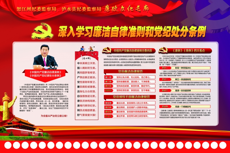 截至目前,已全面完成對廉政文化長廊102個(gè)板塊的更新工作,此次更新以《黨章》《中國共產(chǎn)黨廉潔自律準(zhǔn)則》《中國共產(chǎn)黨紀(jì)律處分條例》《中國共產(chǎn)黨巡視工作條例》《推進(jìn)領(lǐng)導(dǎo)干部能上能下若干規(guī)定》《中國共產(chǎn)黨黨組工作條例(試行)》、“兩學(xué)一做”學(xué)習(xí)教育等為主要內(nèi)容,并配以廉政警示格言、漫畫、古詩詞、小故事等圖文并茂的內(nèi)容。