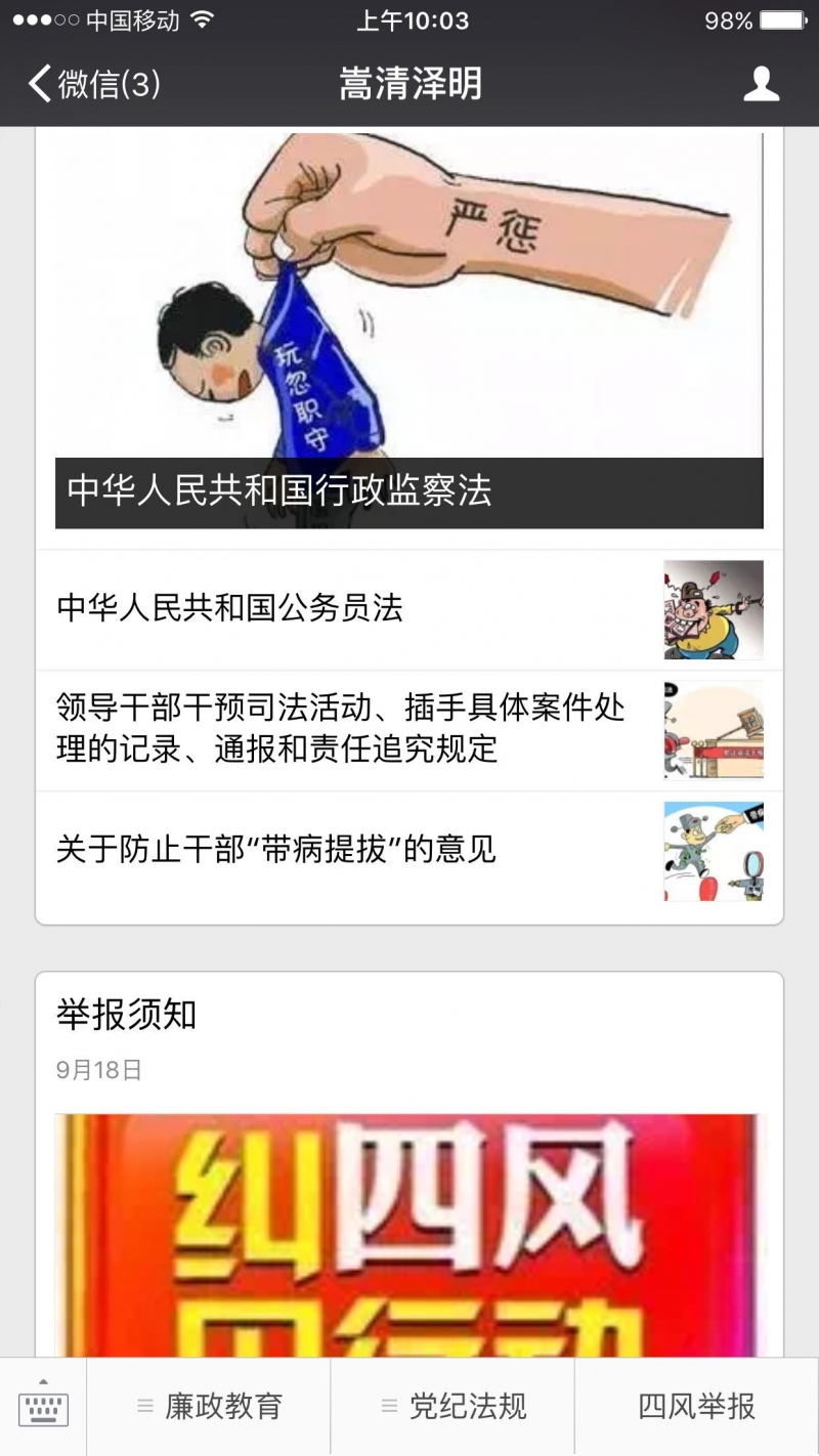 點擊“嵩清澤明”公眾號,映入眼簾就是“廉政教育”、“黨紀法規”、“四風舉報”三大版塊,繼續往下瀏覽就可以到 “高層聲音”“工作動態”“紀律審查”“黨風政風”“廉政教育”“學思踐悟”“四種形態”“以案警示”8個欄目。