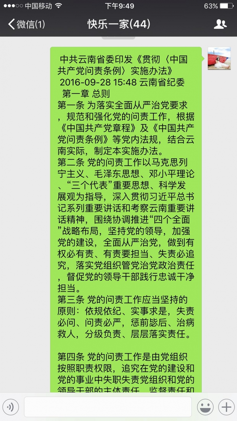 互聯網+新媒體群,學習更深入。 建立了“嵩明縣紀檢監察工作”QQ群、微信群,用于44名紀檢監察干部工作、學習交流。從中央紀委監察部網站、云南省紀委省監察廳網站、昆明市黨風廉政網中轉載《問責條例》原文學習和內容解讀14條,紀檢干部在群中交流學習心得體會,分享學習經驗,研討《問責條例》運用等,營造了“比、學、敢、超”的良好氛圍。(王瑞華)