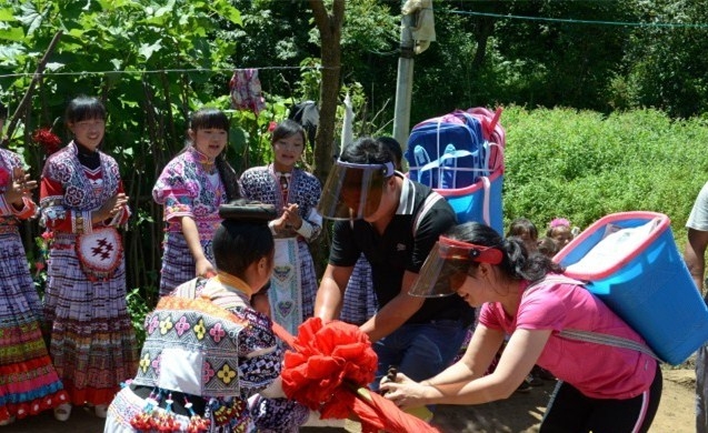 聽說有縣上的同志給他們送書來,小組長王興組織起苗族同胞為隊員們準備了最為隆重的苗族禮儀——羊角酒,盛滿酒的羊角在陽光下黝黑透亮,猶如苗家兒女常年接受烈日炙烤的臉龐。絲絲烈酒淌進了隊員們疲憊的心房,他們臉上露出了欣慰的笑容。王興激動地說:“有了這些書和文具,孩子們肯定會更加努力地學習?!?