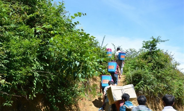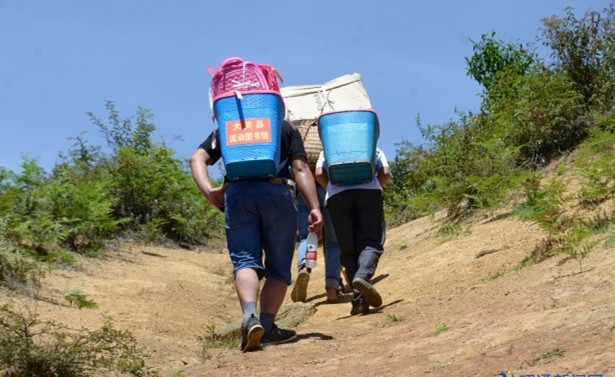 當日早晨7時許,大關縣“流動圖書館”的8名工作隊員及3名志愿者,乘坐準備好的兩輛越野車載著300多冊圖書從縣城出發,從山腳一路顛簸慢慢向山頂行進,兩小時后到達了公路的盡頭。經過分裝,工作隊員們背著盛滿圖書的背篼沿著坎坷不平的山路前行。此時烈日當空,蔚藍的天空沒有一朵云彩,氣溫接近了30攝氏度。每名隊員背負著至少30余斤的書籍,每一步都走得極為吃力,滿臉的汗水足以說明他們體力正在不斷的透支中。兩個多小時的艱難跋涉,終于到達了位于“天際”的海壩小組。此次除了圖書,工作隊還給老鄉們帶去了日常生活和學習用品,給孩子們背來新書包和文具。