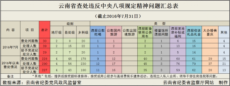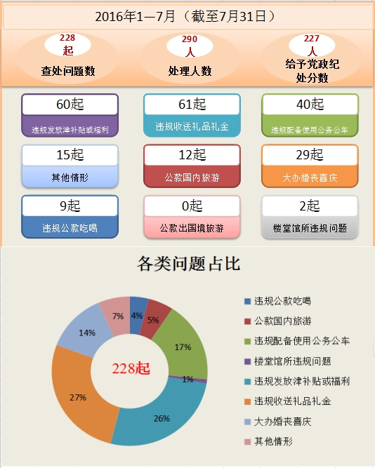 今年1至7月,云南省各級紀檢監察機關查處違反中央八項規定精神問題228起,處理290人,給予黨政紀處分227人。從查處問題類別看,違規發放津補貼或福利問題60起,占26.3%;違規收送禮品禮金問題61起,占26.7%;違規配備使用公務用車問題40起,占17.5%;大辦婚喪喜慶問題29起,占12.7%;違規公款吃喝問題9起,占4%;公款國內旅游問題12起,占5.2%;樓堂館所違規問題2起,占1%;其他問題15起,占6.6%。