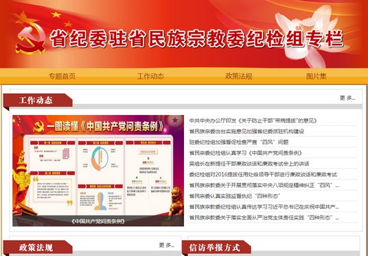 網站按照“嚴肅、權威、及時、準確”的辦網方針,突出紀檢特色,聚焦主責主業,強化新聞發布、政策解讀、成果展示、網絡舉報、廉政教育等5大功能,共設有工作動態、政策法規、圖片集、信訪舉報方式4個欄目,主要實現及時發布中央紀委監察部、省紀委省監察廳、駐省民族宗教委紀檢組及歸口監督的16家委屬事業單位反腐倡廉重大部署、重要會議、重要通報、工作動態等;通過政策問答、法規釋義、專題解讀等形式及時對監督執紀問責工作進行權威解讀;通過廉政教育等宣傳黨風廉政建設和反腐敗工作的創新實踐、成果經驗、典型案例等,進一步把關口前移,及時進行廉政教育,實踐監督執紀“四種形態”,把規矩和紀律挺在前面。