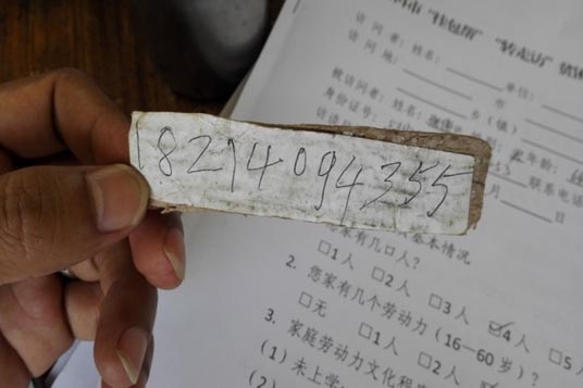當(dāng)詢問到一個叫李云良老大爺他家的電話時,他從自己的枕頭下翻出一張用小紙條貼在紙板上的電話號碼,用一雙粗糙又長滿老繭的手遞給了我,一下子我的眼睛模糊了,眼淚在眼眶里徘徊。原來楊正權(quán)老人沒讀過書,兒子和兒媳外出打工,有兩個孫子還在讀書,生活負(fù)擔(dān)很重,只剩下他和老伴留守在家。