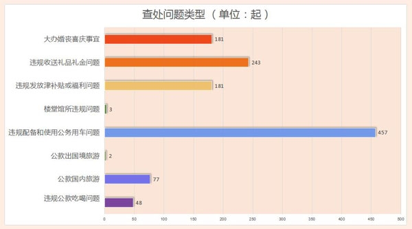 從違紀問題類型看,違規配備和使用公務用車問題最為突出,共計457起,占比18%。其次,是違規收送禮品禮金問題243起,占比9.6%。違規發放津補貼或福利問題和大辦婚喪喜慶問題列第三,均為181起。違規公款吃喝問題48起,公款國內旅游77起,公款出國境旅游2起,樓堂館所違規問題3起,其他問題1347起。