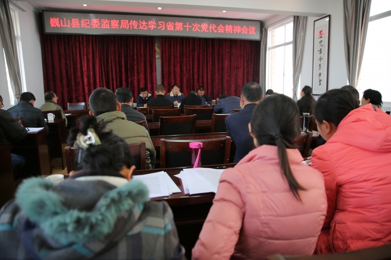 近日,巍山縣紀委召開干部職工會議,專題傳達學習省第十次黨代會精神,縣紀委、監察局全體干部參加會議。縣委常委、縣紀委書記主持會議,對省第十次黨代會精神進行了傳達,對全縣紀檢監察機關如何抓好學習貫徹工作進行安排部署。