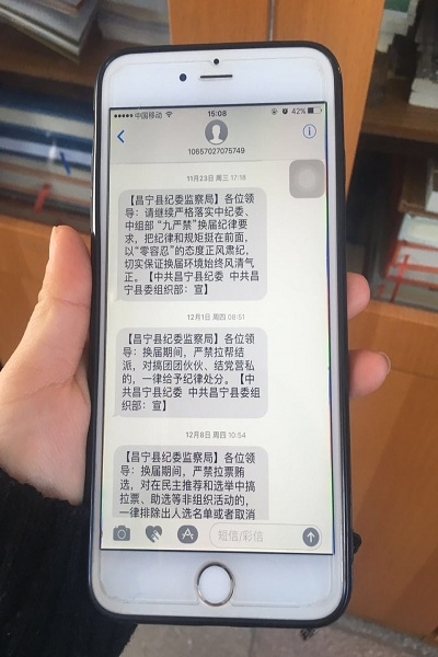 “我們不僅通過短信平臺傳播廉政短信,還通過宣傳欄、播放警示教育片等途徑多角度、多形式、全方位宣傳換屆紀律?!笨h紀委宣傳部負責人介紹到。