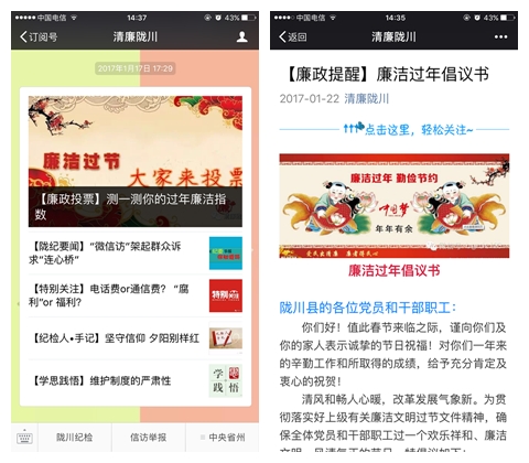 “微投票”測試廉潔過年指數?!按竽瓿跻唬愕氖謾C就收到了一些老板發來的電子紅包,你該怎么處理呢?”“春節前,單位準備給干部職工發放節日慰問品,你會怎么做呢”……1月17日,“清廉隴川”發起了一個廉政“微投票”,測的是“你會不會被紀委請去‘喝咖啡’”,內容多為黨員干部日常工作生活中經常會碰到的問題。在投票過程中,使干部群眾正視自己、警醒自己,既學會了拒絕誘惑的本領,又提高了拒絕誘惑的勇氣,通過全民參與的廉政警示教育方式,潛移默化地進一步學習有關紀律規定,警醒廣大黨員干部在工作生活中,如何不踩紅線、守住底線,做到防微杜漸。