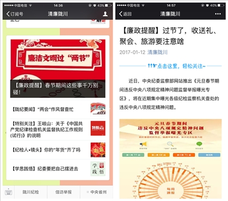 近日,隴川縣紀委監察局借助微信平臺優勢資源,從小處入手、從細處發力,不斷拓展教育新形式,加強廉潔教育的影響力和滲透力,在全縣范圍內營造風清氣正“廉節”氛圍。