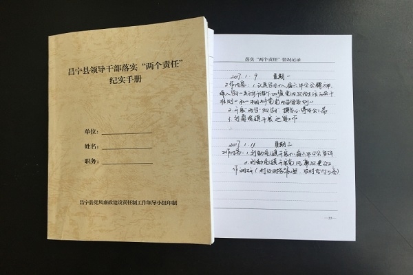 該手冊分兩個部分,第一部分為有關制度規定和文件,供領導干部學習和使用;第二部分為落實“兩個責任”情況記錄,由領導干部自領到《紀實手冊》開始,將個人學習教育、聽取匯報、廉政談話、問題調研、監督檢查、貫徹執行中央八項規定精神、糾正“四風”、執行請示報告制度等落實“兩個責任”情況實行流程記錄、一事一記,便于各級領導干部更好地了解自身在黨風廉政建設和反腐敗工作中的職責和任務,真正把責任扛穩抓實。它不僅是學習工作記錄本,更是差缺補漏的“警示本”。