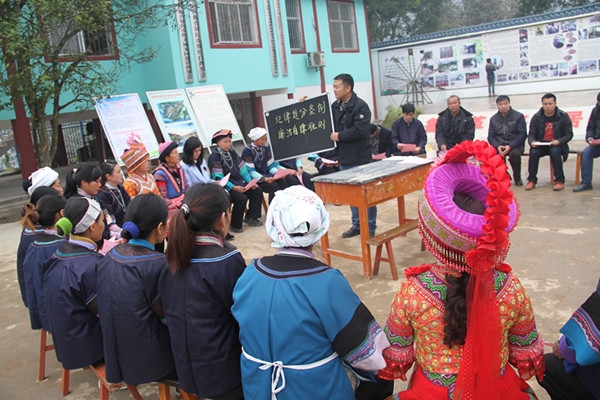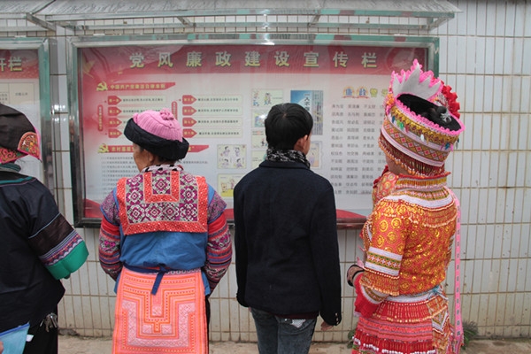 布依族、苗族群眾查看魯布革鄉(xiāng)黨風廉政建設宣傳內(nèi)容