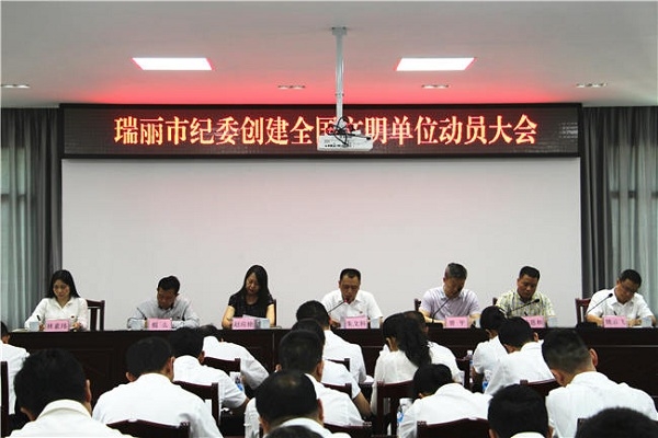 近日,瑞麗市紀委組織全體干部職工召開創建全國文明單位動員大會。省文明辦、州文明辦、市委宣傳部相關領導蒞會指導。市委常委、市紀委書記作動員講話。