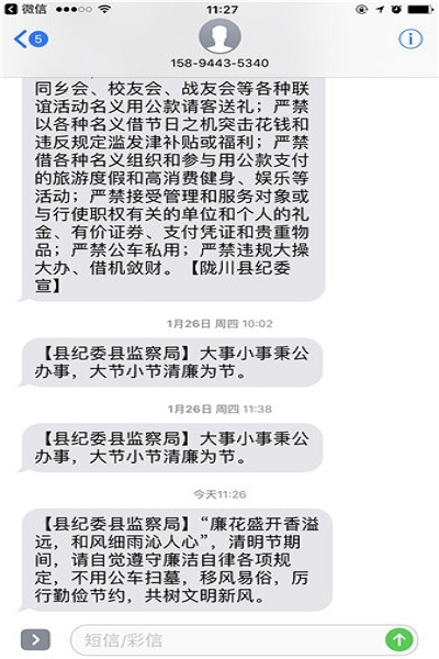 “廉政短信溫馨暖人,及時對黨員干部‘咬耳’‘扯袖’,讓大家在潛移默化中得到警醒和教育。”縣紀委宣傳部部長說道。