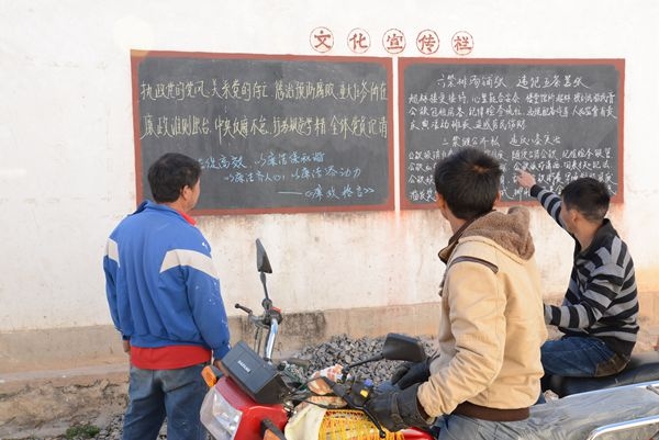 仁和鎮勒平村群眾在村民自辦的宣傳欄觀看廉潔過節的順口溜和廉政格言