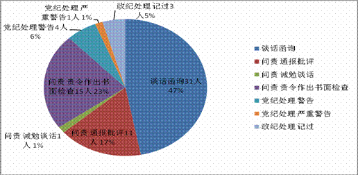 通過分析2016年數據可以清晰看出,科級領導干部460人,被談話函詢、問責及組織處理62人,比例為13.48%。已適用第一種形態55人,其中談話函詢31人,問責27人。在被問責的27名干部中,通報批評11人,誡勉談話1人,責令作出書面檢查15人。已適用第二種形態8人,其中政紀處理記過3人,黨紀處理警告4人,黨紀處理嚴重警告1人。另有3名懲處未到期干部。