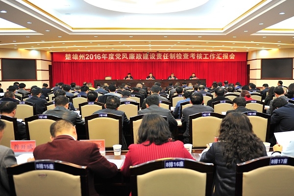 陸俊華同志出席會議并講話,楚雄州委書記代表州委匯報了楚雄州2016年度黨風廉政建設和反腐敗工作情況。省委第五檢查考核組組長、省紀委常委、秘書長周航以及省委第五檢查考核組成員出席會議。