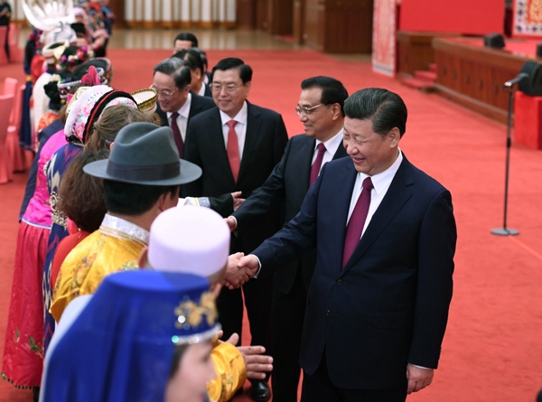 人民大會堂宴會廳燈火輝煌,歡聲笑語,洋溢著喜慶熱烈的氣氛。19時45分,在歡快的樂曲聲中,習近平等黨和國家領導人走進會場,全場響起熱烈掌聲。習近平等微笑著同身著民族服裝的少數民族代表委員親切握手、互致問候。