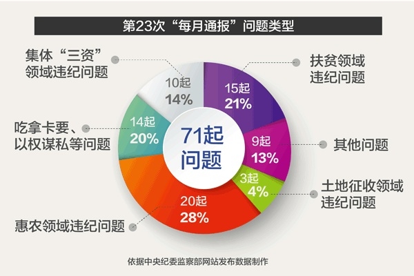 5月11日,中央紀(jì)委第23次集中通報(bào)各級(jí)紀(jì)檢監(jiān)察機(jī)關(guān)查處的71起侵害群眾利益的不正之風(fēng)和腐敗問(wèn)題,點(diǎn)名道姓通報(bào)曝光88人。其中,涉及惠農(nóng)領(lǐng)域違紀(jì)問(wèn)題20起,占比28%;涉及扶貧領(lǐng)域違紀(jì)問(wèn)題15起,占比21%;涉及吃拿卡要、以權(quán)謀私等問(wèn)題14起,占比20%;涉及集體“三資”違紀(jì)問(wèn)題10起,占查處總量的14%;涉及土地征收領(lǐng)域違紀(jì)問(wèn)題3起,占比4%;其他違紀(jì)問(wèn)題9起,占比13%。