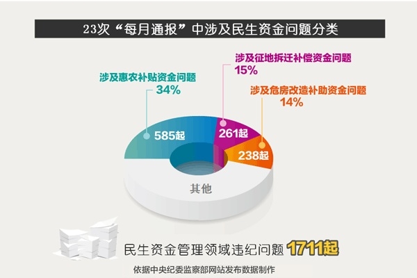 從通報(bào)的問(wèn)題看,惠農(nóng)補(bǔ)貼、危房改造、征地拆遷領(lǐng)域,成為不正之風(fēng)和腐敗問(wèn)題高發(fā)地。各級(jí)紀(jì)檢監(jiān)察機(jī)關(guān)為打通民生資金監(jiān)管“最后一公里”,重拳出擊、動(dòng)真碰硬。中央紀(jì)委監(jiān)察部網(wǎng)站“每月通報(bào)”數(shù)據(jù)顯示,各級(jí)紀(jì)檢監(jiān)察機(jī)關(guān)共查處涉及民生資金管理領(lǐng)域違紀(jì)問(wèn)題1711起、點(diǎn)名道姓2407人,均占查處總數(shù)70%以上。包括查處涉及惠農(nóng)補(bǔ)貼資金違紀(jì)問(wèn)題585起、占34%;查處涉及征地拆遷補(bǔ)償資金違紀(jì)問(wèn)題261起、占15%;查處涉及危房改造補(bǔ)助資金違紀(jì)問(wèn)題238起、占14%。