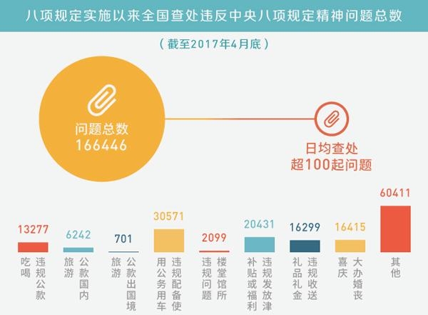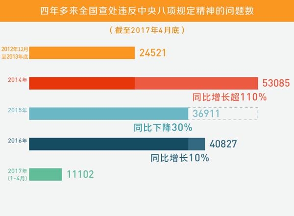 據統計,自2012年12月中央八項規定實施至2017年4月底,全國累計查處違反中央八項規定精神問題16萬多起,處分11萬多人。平均每天因違反中央八項規定精神被查處的問題就超過100起。