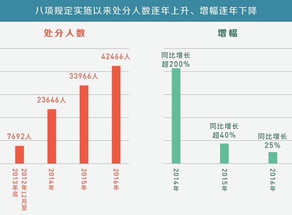 從處分人數看,自2012年12月至2013年底,全國因違反中央八項規定精神受到處分的人數共7000多人;2014年處分人數共2萬多人,同比增長超過200%;2015年處分3萬多人,同比增長超過40%;2016年處分4萬多人,同比增長25%。