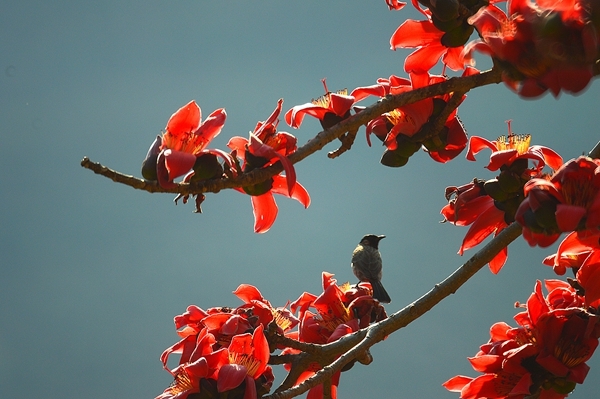 三月的怒江沿岸,一朵朵一簇簇綻放的紅木棉,像一團團熊熊的火在燃燒,或傲然獨立于山脊,或三兩相依于路旁,或好似邀約地矗立于江畔,點綴出一種別樣的美。