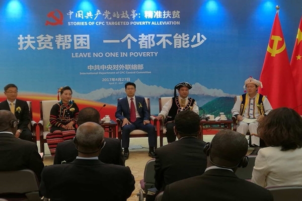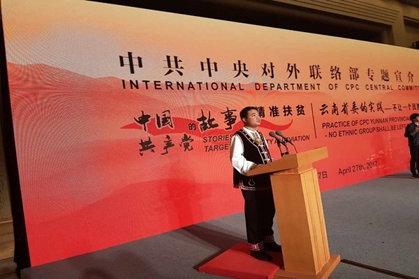 近日,中共中央對外聯(lián)絡(luò)部在北京舉辦首場“中國共產(chǎn)黨的故事”專題宣介會。中聯(lián)部圍繞“精準(zhǔn)扶貧——不讓一個(gè)民族掉隊(duì)”主題,以云南省委實(shí)踐為例,向到場的聯(lián)合國駐華機(jī)構(gòu)代表、外國駐華使節(jié)及政黨代表等近400位來賓,介紹云南省深入推進(jìn)脫貧攻堅(jiān)工作的實(shí)踐和成效。