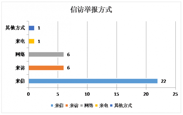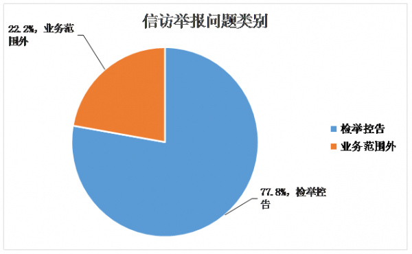 在接收的36件信訪舉報件中,屬檢舉控告28件(重復件2件),占接受信訪總量的77.8%,其中署名舉報15件,占檢控類總量的53.6%;業務范圍外8件,占接受信訪總量的22.2%。