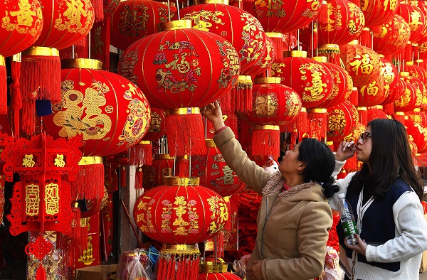 新年新氣象,母女兩人一起精挑細選購買吉祥物,希望在新的一年里事事順心、吉祥如意。(黃存義 攝)