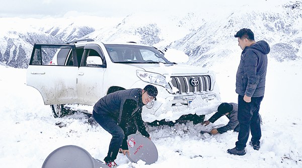 近日,四川省道孚縣紀檢監察干部到七美鄉開展村級換屆監督檢查時,突遇大雪,車輛被困無法前行,隨車人員下車鏟雪開路。陳富強 攝