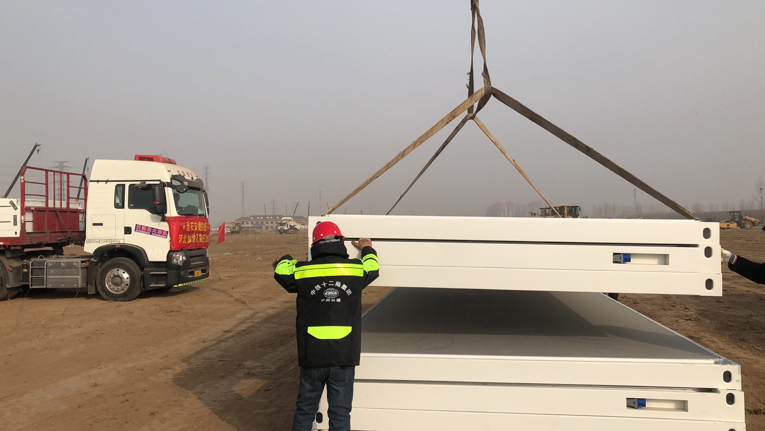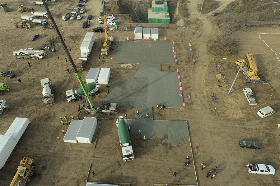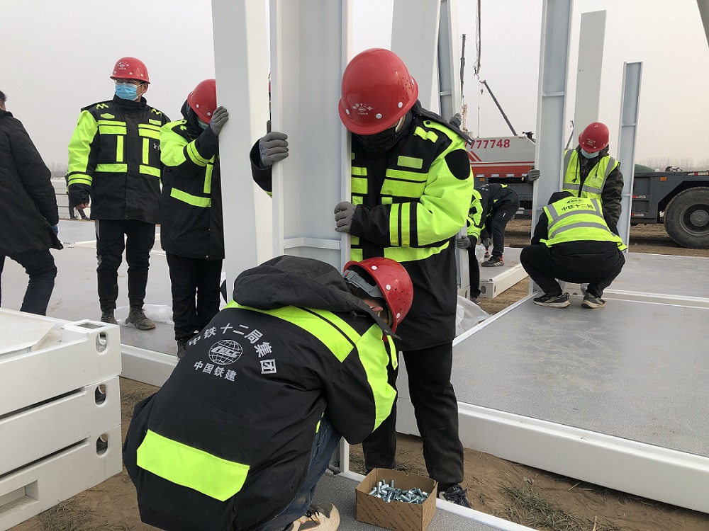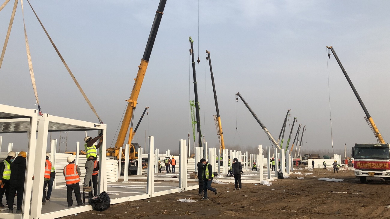 圖為1月14日上午11時許,工人開始在石家莊市集中隔離點建設工地安裝板房。(中國鐵建供圖)