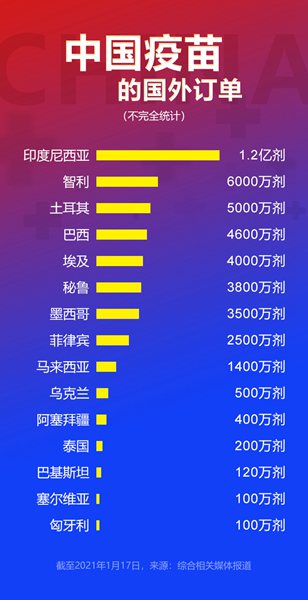 據(jù)新華網(wǎng)報(bào)道,自2020年底中國首個(gè)疫苗正式上市以來,阿聯(lián)酋、巴林、摩洛哥、巴基斯坦、土耳其、阿根廷、埃及、巴西、泰國、墨西哥、秘魯?shù)热?0多個(gè)國家已與中國簽署新冠疫苗訂購協(xié)議。其中,阿聯(lián)酋、埃及、巴林3國已經(jīng)正式批準(zhǔn)使用中國疫苗,還有多國有購買意向。而從訂單數(shù)量來看,中國疫苗已經(jīng)拿到16個(gè)國家及地區(qū)超5億劑疫苗的合同。