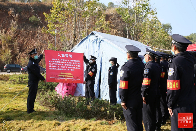 1月2日,云南省保山市施甸縣公安局在疫情防控一線的水長707防控監(jiān)測點成立臨時黨支部,組織黨員先鋒隊沖鋒在前,筑牢邊境疫情防控安全屏障。圖為臨時黨支部黨員在宣誓。(云南省保山市施甸縣紀(jì)委監(jiān)委供 楊劍鋒 攝)