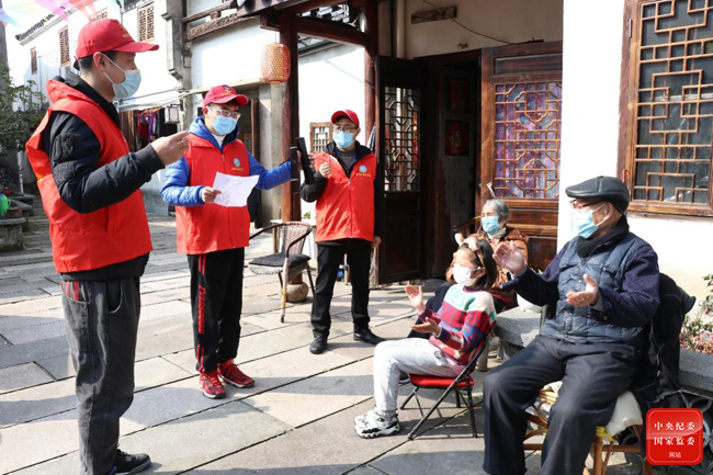 1月9日,浙江省湖州市南潯區(qū)菱湖鎮(zhèn)“紅菱”宣講團(tuán)黨員干部用小快板和“視頻+村微信群”的方式,向群眾宣講各類疫情信息及防疫知識。(浙江省湖州市南潯區(qū)紀(jì)委監(jiān)委供 李則名 攝)