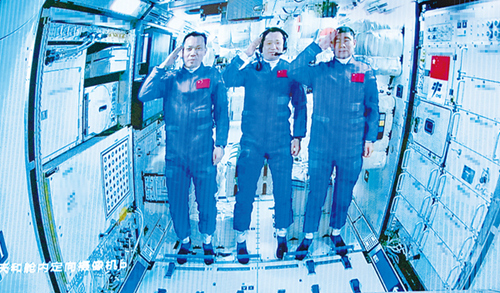 圖為6月17日在北京航天飛行控制中心拍攝的進駐天和核心艙的航天員向全國人民敬禮致意的畫面。新華社記者 金立旺 攝