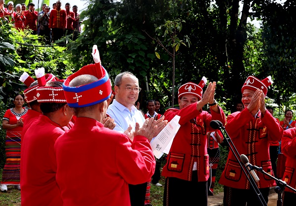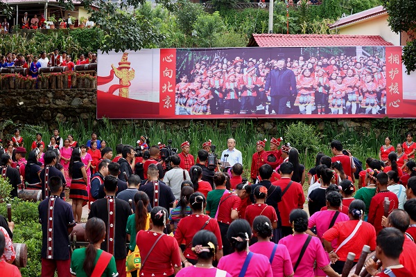 這是載入阿佤山歷史的時刻,佤族群眾身著節(jié)日盛裝,載歌載舞,阿佤山成為一片歡樂的海洋。阮成發(fā)鄭重宣讀了習近平總書記的回信。宣讀完畢,現(xiàn)場群眾齊聲歡呼,老支書代表巖翁和班洪村黨支部書記賽茸激動地表達了心聲,佤族青年擊響木鼓,男女老幼唱起《阿佤人民唱新歌》,抒發(fā)佤族群眾心向黨、心向國家的真摯感情,感謝總書記、感恩黨中央的共同心聲。