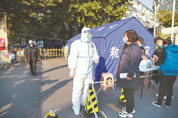 圖為10月20日,北京市豐臺(tái)區(qū)紀(jì)委監(jiān)委第二監(jiān)督檢查室工作人員到新增確診病例所在街道,對(duì)隔離期間工作人員配備、社區(qū)物資儲(chǔ)備及配送情況等進(jìn)行監(jiān)督檢查。李承橙 攝