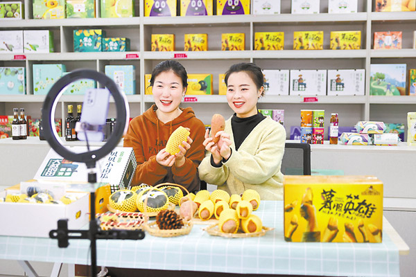 11月2日,江蘇省連云港市贛榆區石橋鎮一家電商企業的員工在直播銷售地方特產。(圖片來源:視覺中國)