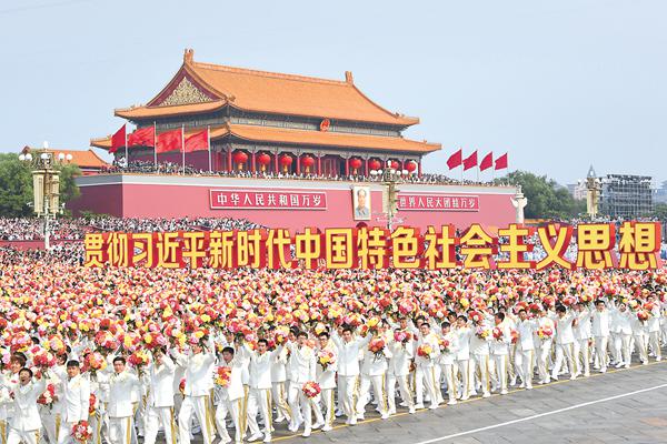 圖為2019年10月1日,慶祝中華人民共和國成立70周年群眾游行中的偉大復興方陣。 新華社記者 劉軍喜 攝