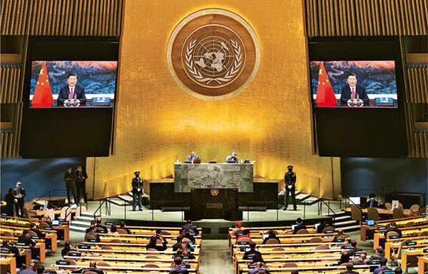 2021年9月21日,國家主席習近平在北京以視頻方式出席第七十六屆聯合國大會一般性辯論并發表題為《堅定信心 共克時艱 共建更加美好的世界》的重要講話。這是大會現場。 新華社記者 王迎/攝
